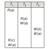 There exists a blind write W 3 A in the given schedule S. Performing the Writing operation updation without reading operation such write operation is known as a blind write. If blind write appear in any view serializable schedule that is not conflict serializable.